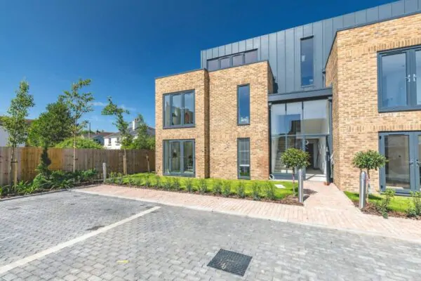 Landscape garden area with curved winding pathways surrounding a new-build residential development in Reading
