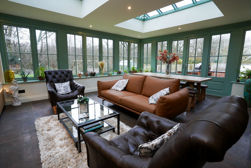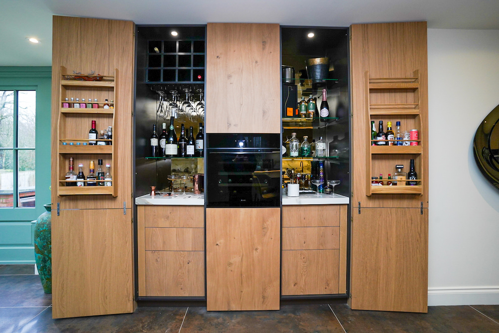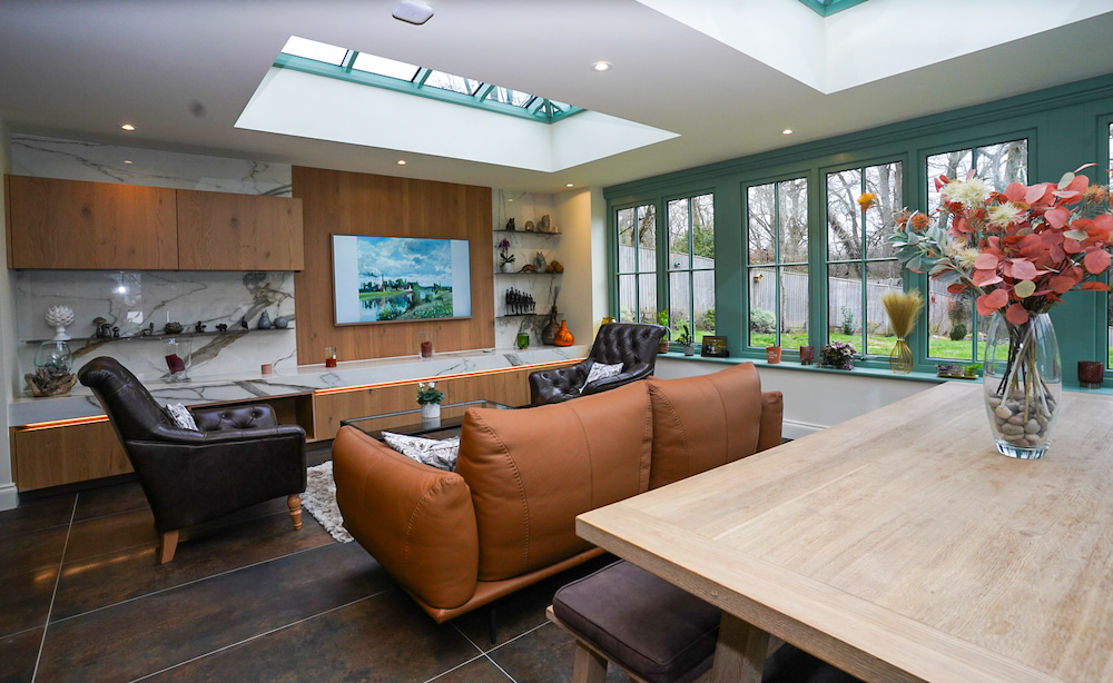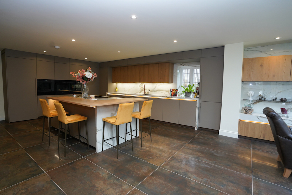 In this open-plan extension, we supplied the kitchen, media room, bar area and utility room to create a cohesive and functional living space. The handleless kitchen features a striking marble waterfall island, integrated appliances and warm wood finishes, flowing seamlessly into a bespoke media wall and dedicated bar area. Subtle lighting, integrated storage and carefully selected fixtures ensure the design balances contemporary style with everyday practicality throughout the home.