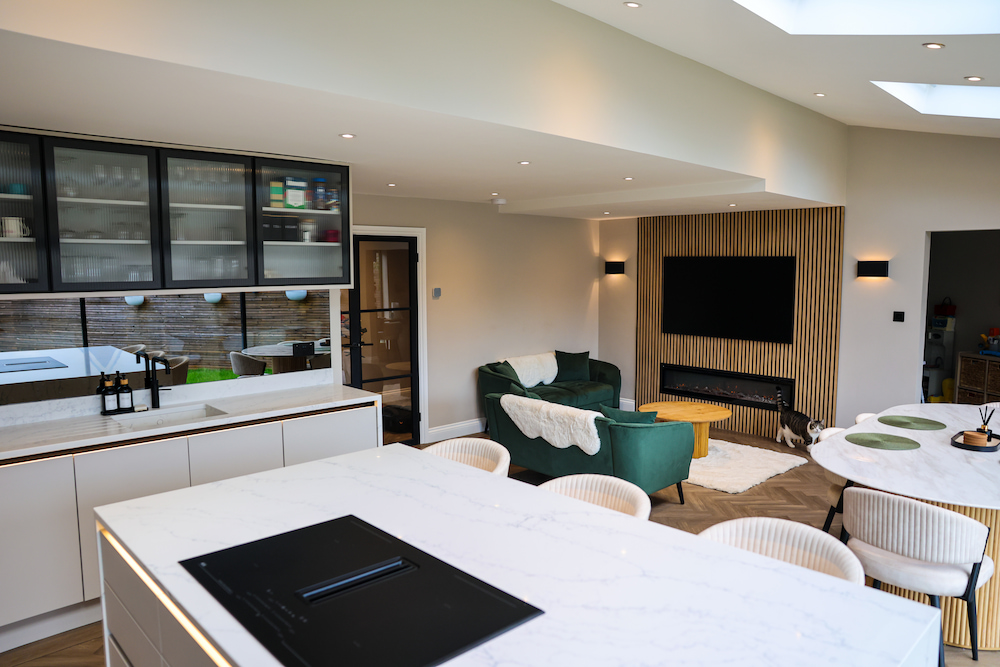 This contemporary kitchen project was designed to sit seamlessly within an open-plan family home, combining clean-lined, handleless cabinetry with a strong architectural layout. A large central island anchors the space, offering generous preparation areas, integrated appliances, and informal seating for everyday use and entertaining. Glass-front wall cabinets introduce visual lightness, while a neutral palette of white finishes and warm flooring creates a bright, welcoming environment. The result is a refined yet practical kitchen that balances modern design with long-term functionality and everyday living.