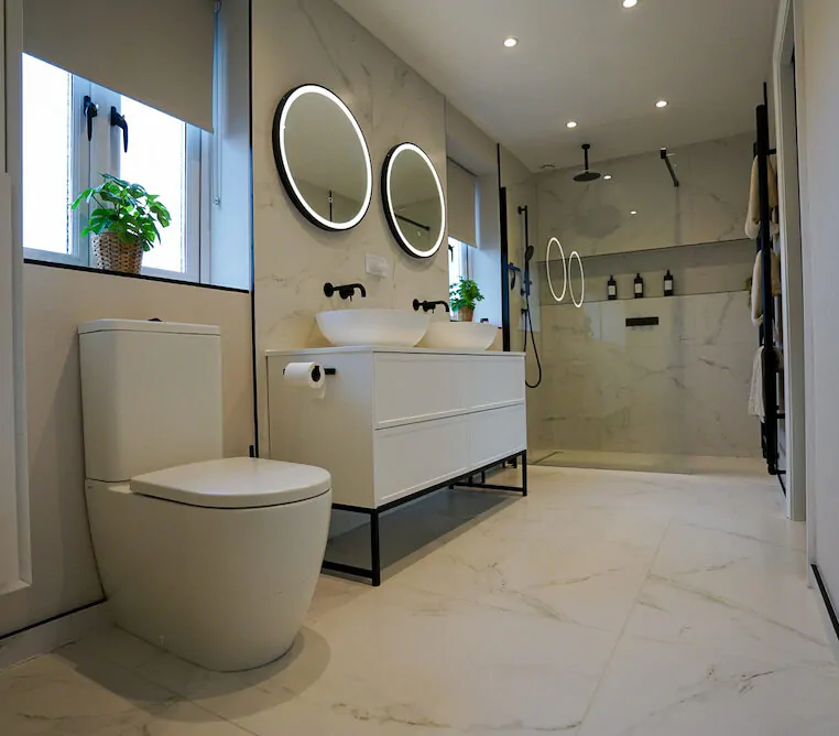 Modern Bathroom Design with Marble-Effect Tiles & Matt Black Fixtures
