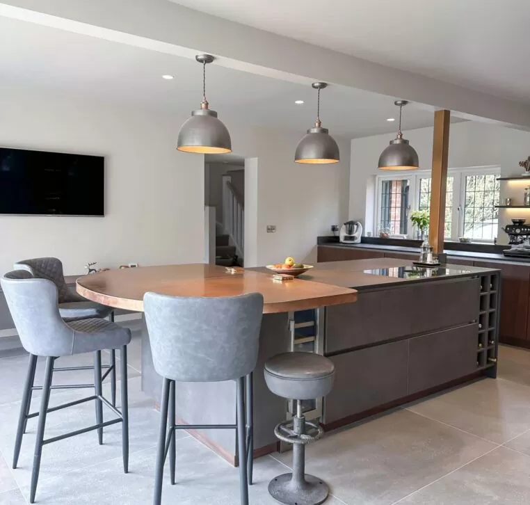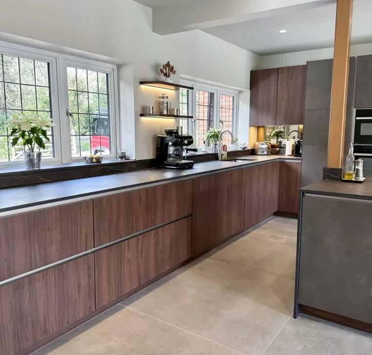 Warm, Sleek, Kitchen with Matt Stone & Wood Effect Cabinets
